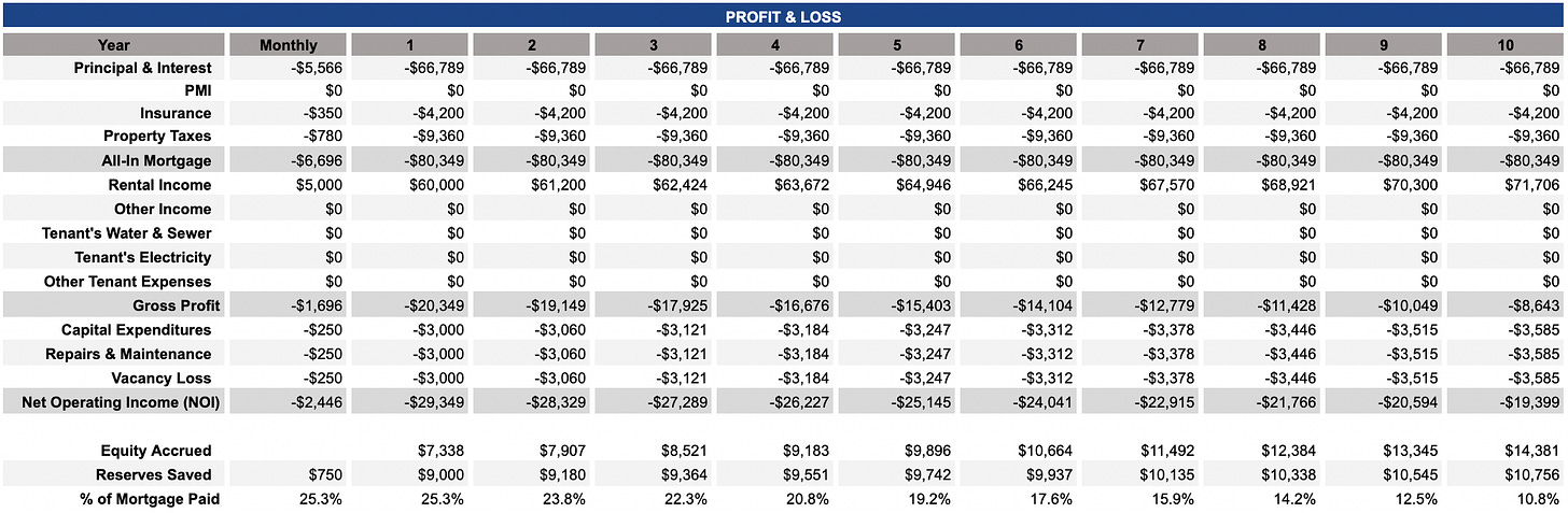 We’re also setting aside $9,000 ($750/mo) in the first year for capex, maintenance, and vacancy. Given the property's age, this is a crucial consideration. Including that, our year 1 out-of-pocket living cost is $29,352. We accrue $7,338 in home equity in our first year, so the net living cost comes to $22,014 or $1,835/mo.